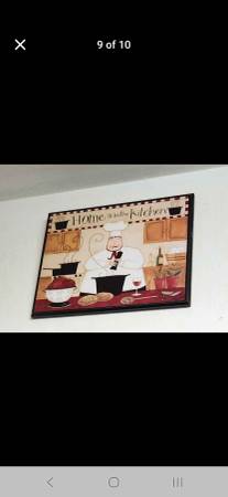 Complete Italian Fat Chef kitchen collection that includes multiple pictures, menu chalkboard, canister set, salt n pepper shakers, and a statue.